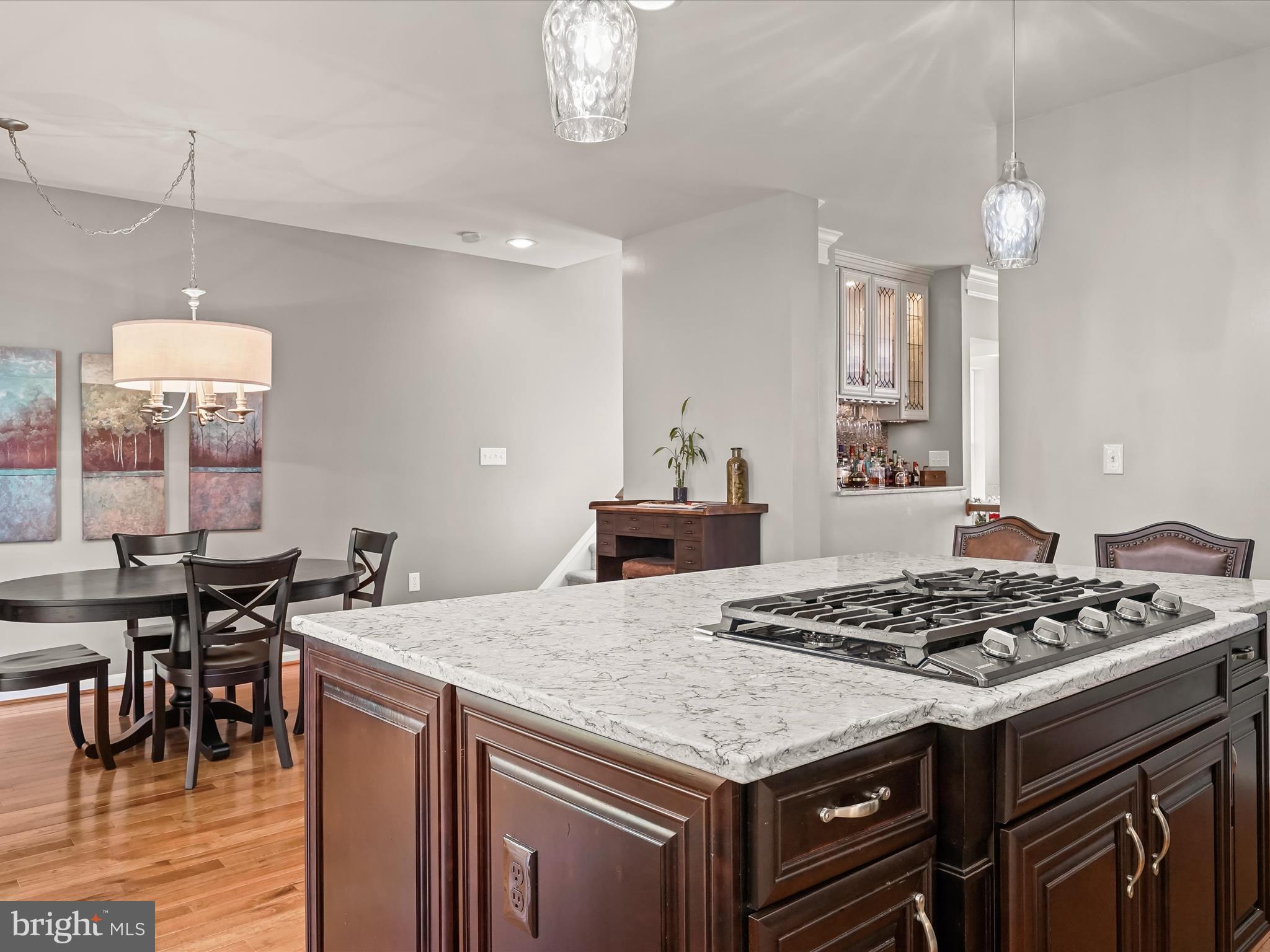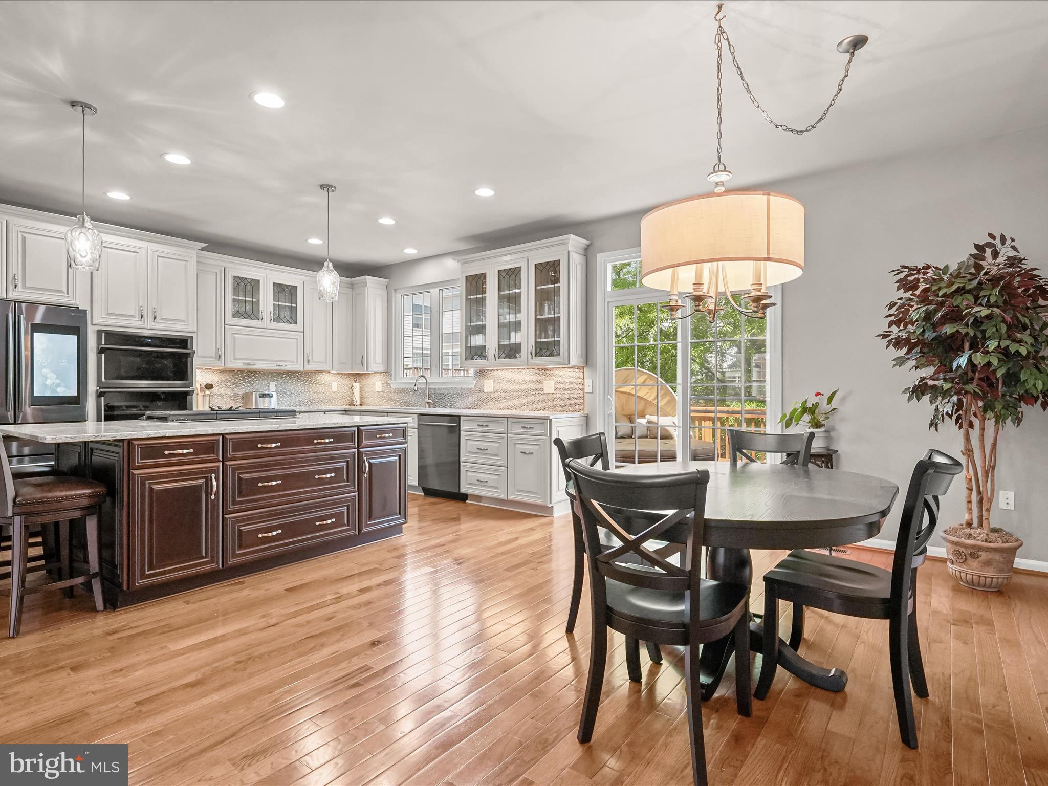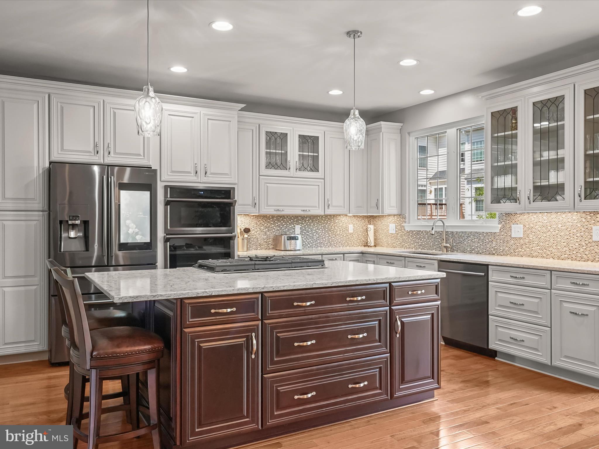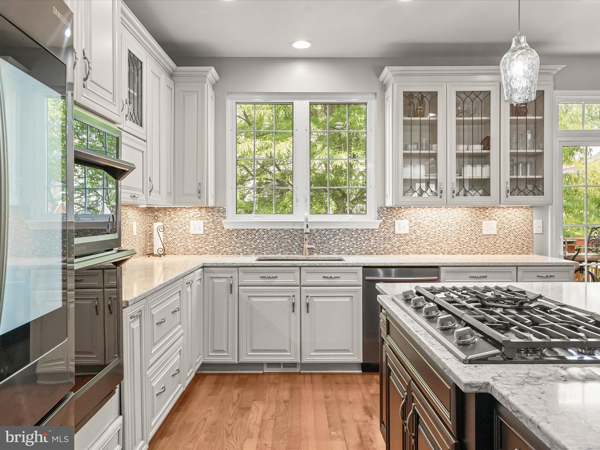 The newly updated and expanded Kitchen is a $100,000 show stopper! Shenandoah Westfall Painted Harbor cabinetry with pullout drawers with soft close slides, tiered cutlery drawer, two spice rack pull outs and waste basket storage; Quartz Countertop in Silestone Pietra; Samsung appliance suite: 36-inch 5 Burner Gas Stove with cast iron removable griddle, Touch Panel Microwave/Convection Oven-Self Cleaning Wall Oven Combo, Family Hub 27-7 cubic foot Refrigerator with Ice Maker-Samsung's Family Hub(tm) which lets you see inside your refrigerator, displays current and future weather, manage family's calendars, stream music, write notes, insert photos and much more, 6-cycle Dishwasher with AutoRelease(tm) drying (door automatically opens 5 inches 5-15 minutes prior to ending of cycle to improve drying performance; Quarza by Kraus undermount sink; Broan Downdraft range hood-touch button activated retractable downdraft hood rises from behind the cooktop and retracts when not in use for a seamless design; Backsplash - Americana Series Backsplash Glass Tile Coup De Ville; and Arbor with Motion Sense Spot Resistance (delivers hands-free convenience.
