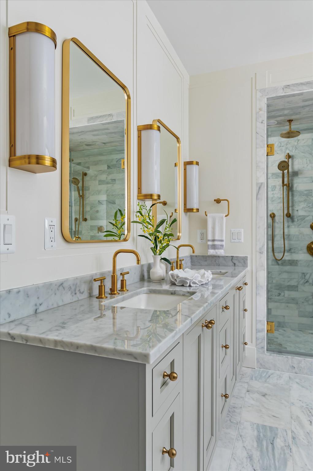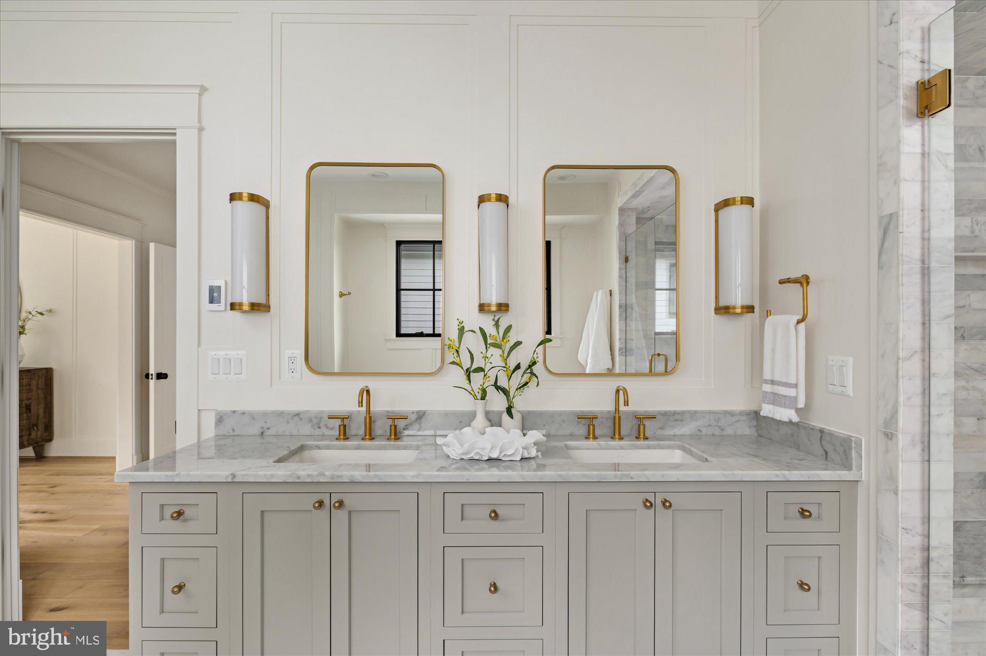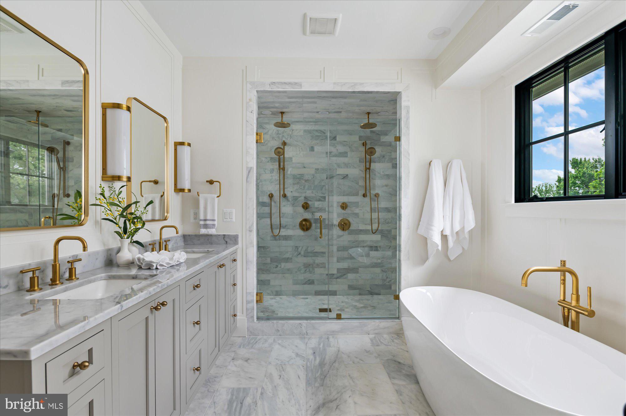 The upper level includes a private primary suite with entrance foyer, two large walk-in closets and designer bathroom with double vanities, soaking tub, a large glass enclosed shower, and heated floors. The remainder of the upper level includes three secondary bedrooms with en-suite bathrooms, walk-in closets, and a large laundry room.