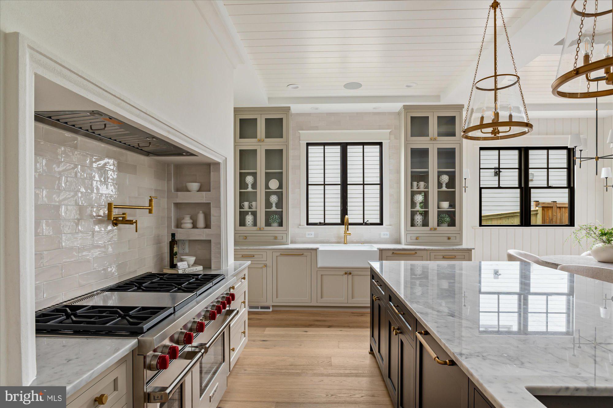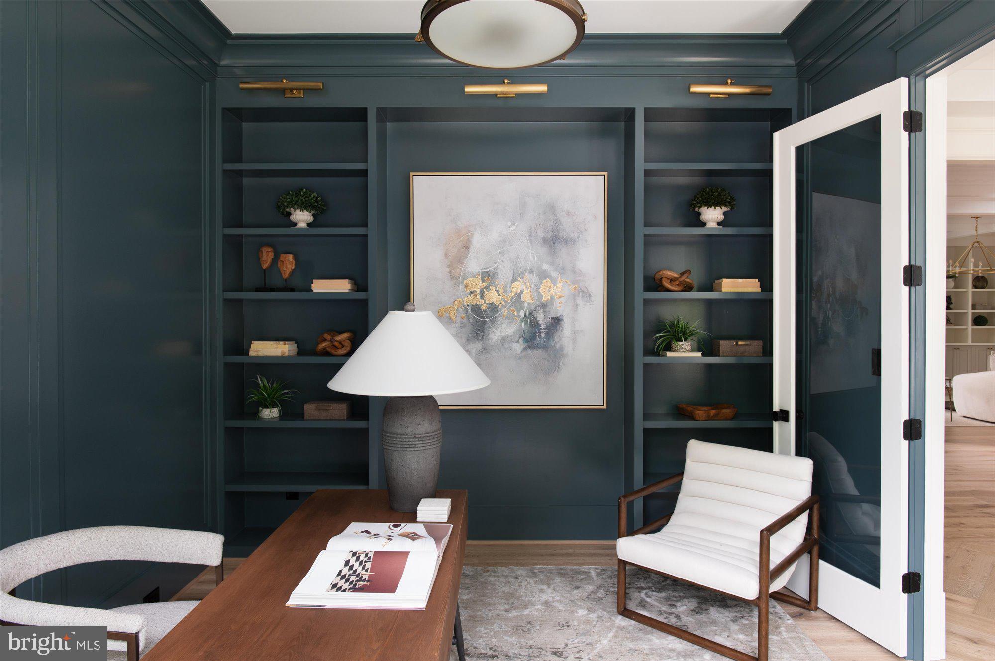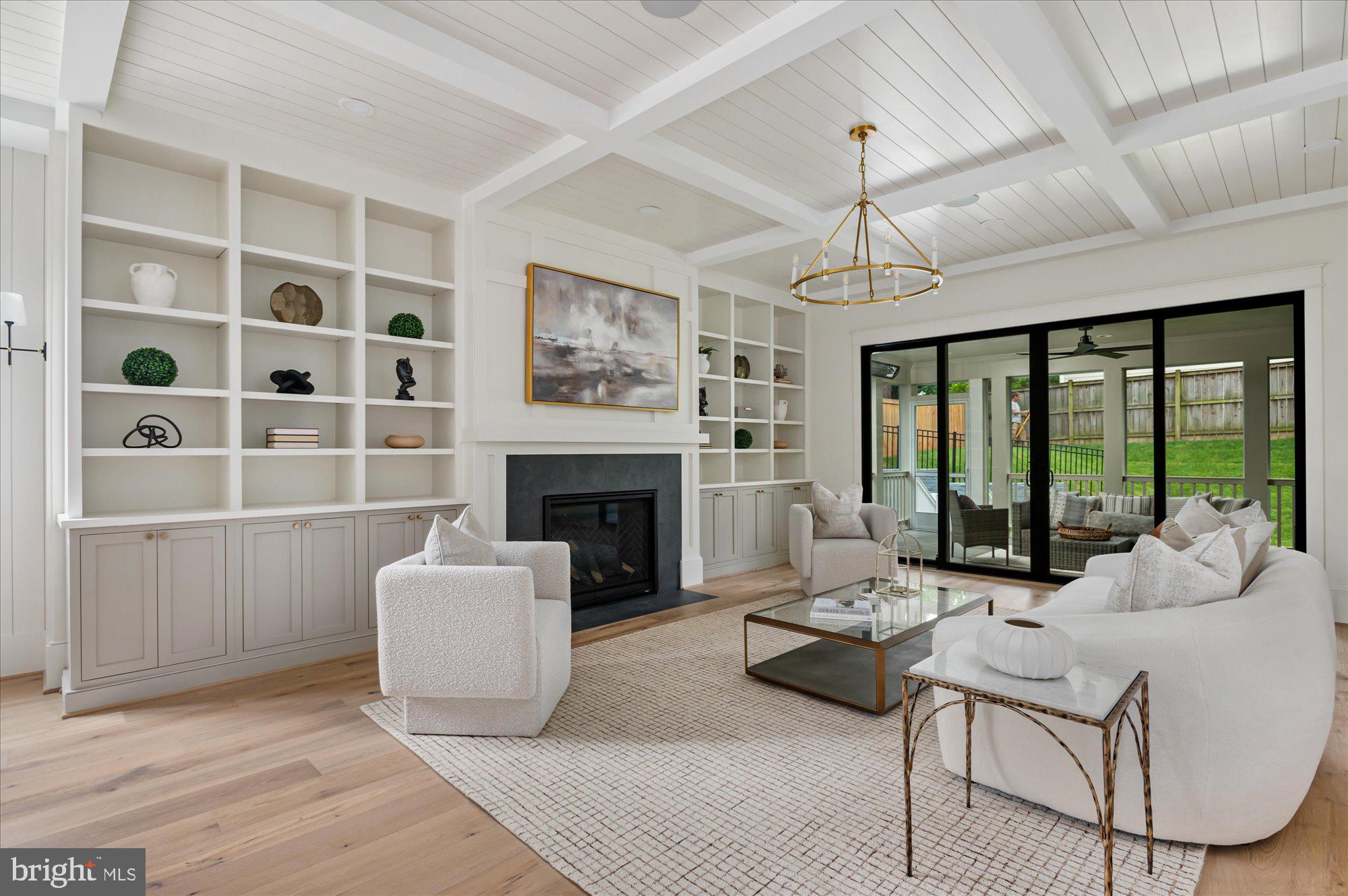 Chevron wide-planked engineered white oak wood floors invite you through the foyer into the house with 10ft ceilings on the main floor and an open-concept layout for easy flow between rooms. In the kitchen, custom cabinetry by Bullseye surrounds a suite of luxury appliances, including a 48" SubZero refrigerator, a 48" Wolf gas range, and dual Cove smart dishwashers elegantly tucked behind wood panels. The family room features a gas fireplace flanked by custom built bookshelves and coffered ceilings, and a smart butler's pantry includes an additional bar area and under-counter fridge. The rest of the main floor includes a mudroom with built-in cubbies, a main level guest suite with a private balcony, an office with custom built cabinetry and bookshelves, and a screen porch overlooking the yard and nearby fields.