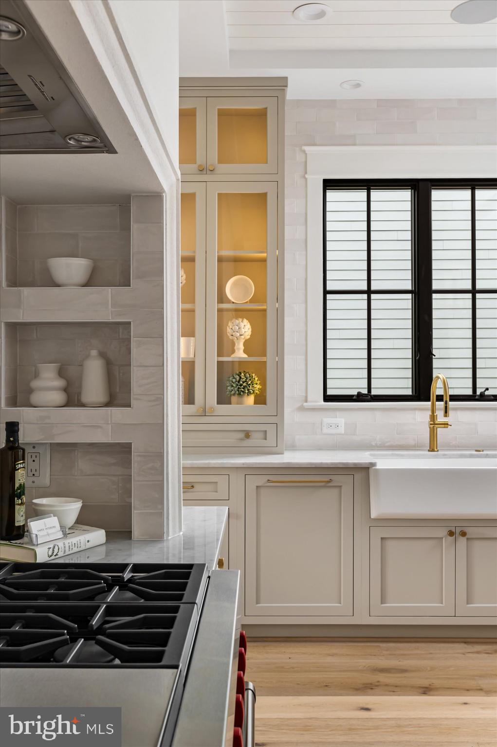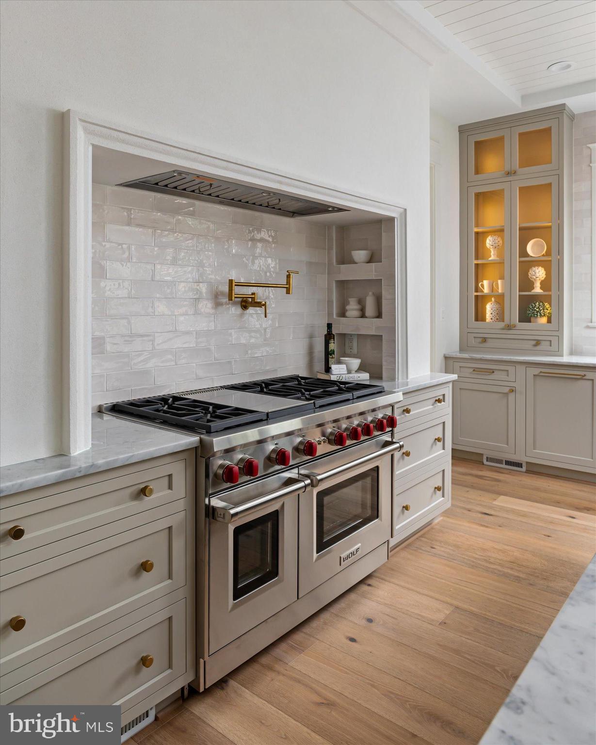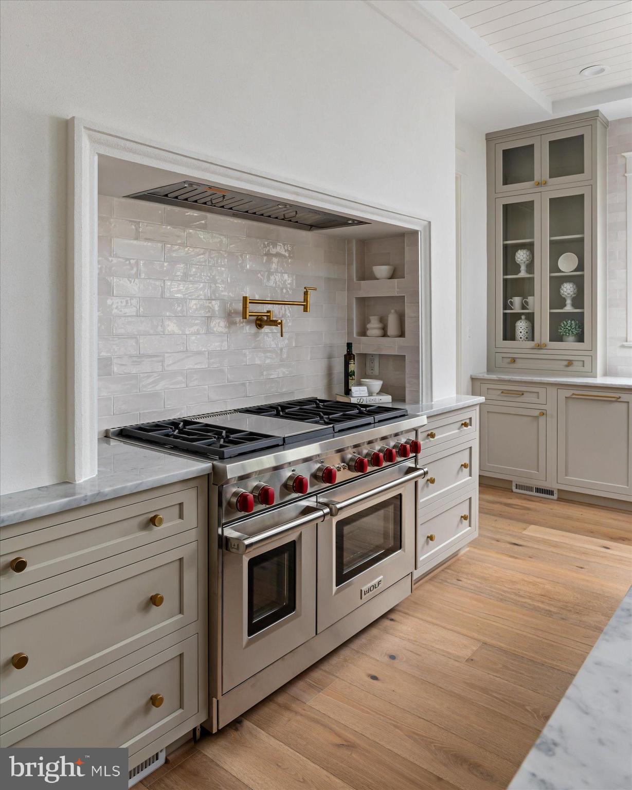 Chevron wide-planked engineered white oak wood floors invite you through the foyer into the house with 10ft ceilings on the main floor and an open-concept layout for easy flow between rooms. In the kitchen, custom cabinetry by Bullseye surrounds a suite of luxury appliances, including a 48" SubZero refrigerator, a 48" Wolf gas range, and dual Cove smart dishwashers elegantly tucked behind wood panels. The family room features a gas fireplace flanked by custom built bookshelves and coffered ceilings, and a smart butler's pantry includes an additional bar area and under-counter fridge. The rest of the main floor includes a mudroom with built-in cubbies, a main level guest suite with a private balcony, an office with custom built cabinetry and bookshelves, and a screen porch overlooking the yard and nearby fields.